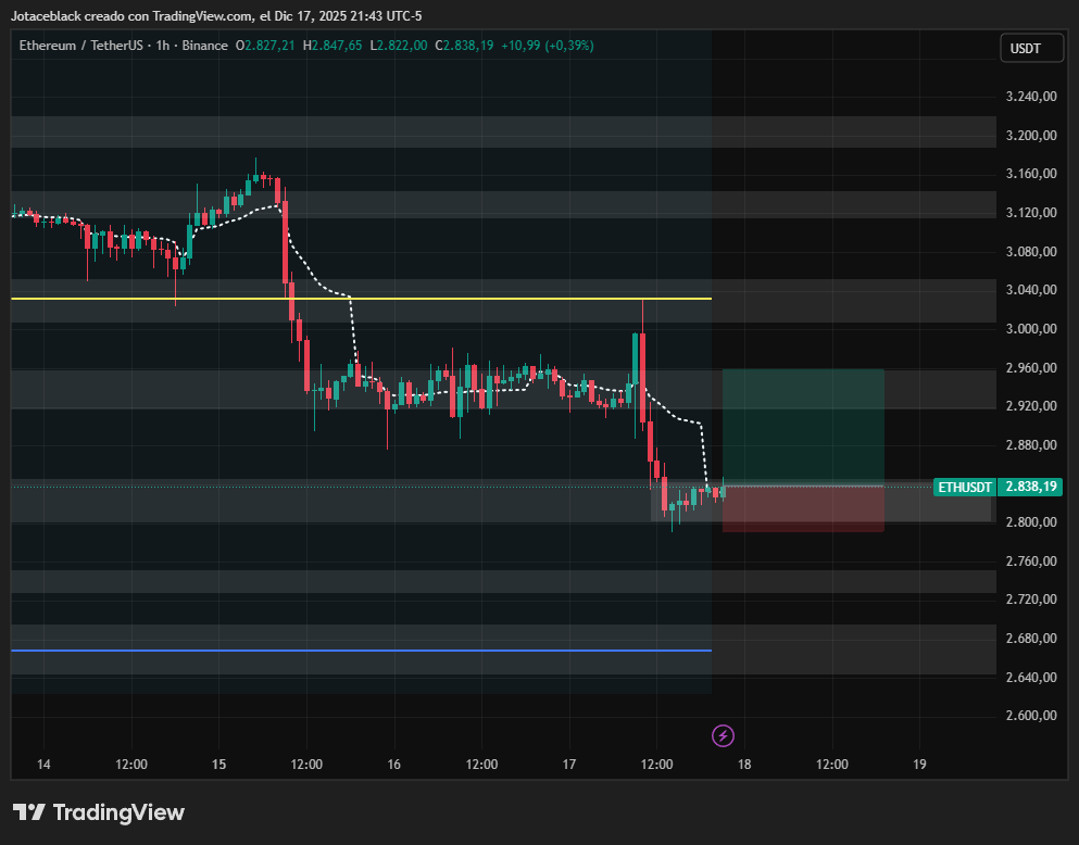 En la apertura del mercado estadounidense, el activo cotizaba en torno a los $2.935 en Binance, antes de repuntar brevemente hasta la zona de $3.030. Sin embargo, el movimiento perdió tracción y dio paso a una caída progresiva que llevó el precio hasta un mínimo intradía cercano a los $2.791.