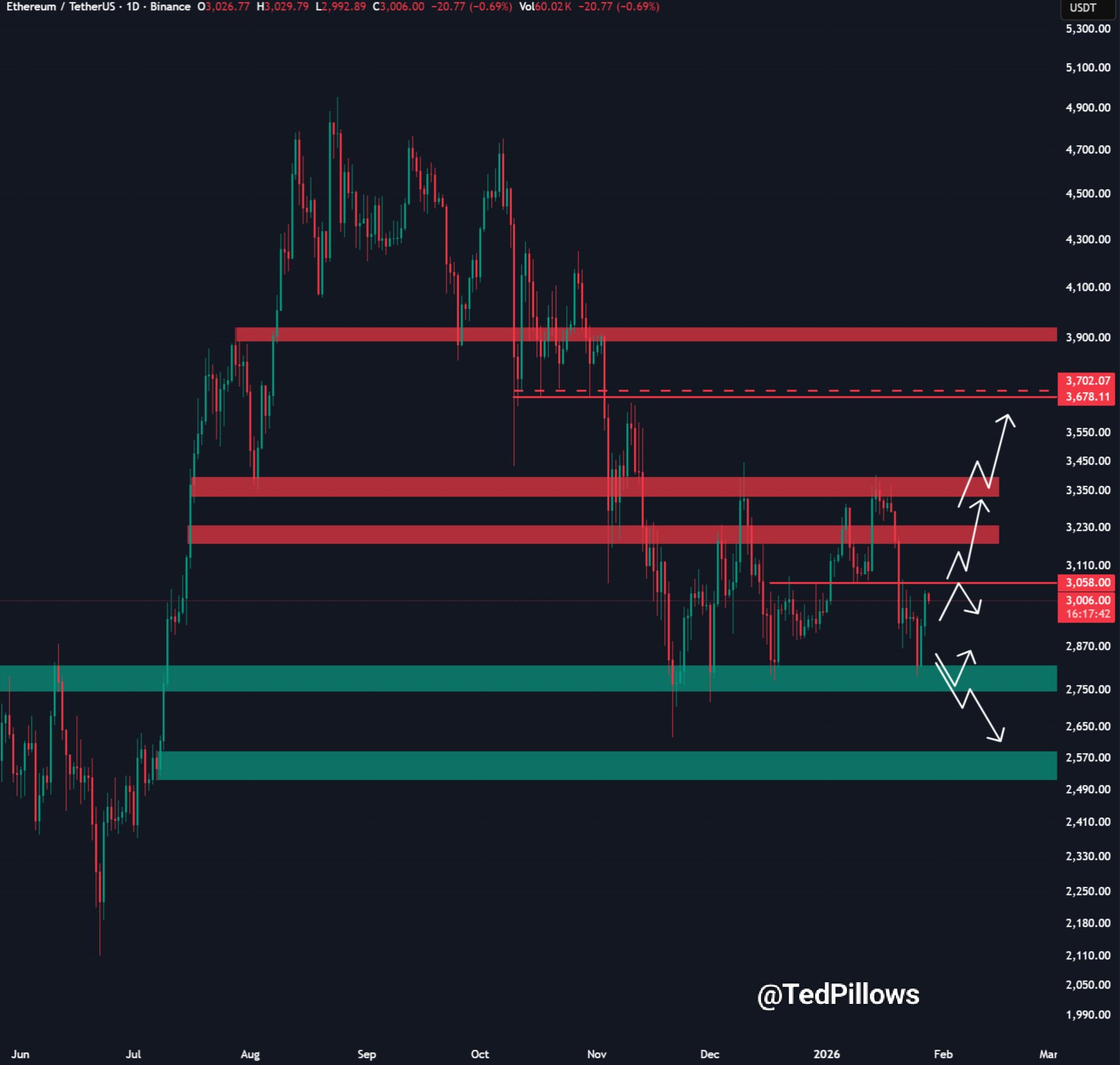 “$ETH ha superado el nivel de $3,000. Ahora, Ethereum necesita un cierre diario por encima de esta zona para avanzar hacia el nivel de $3,200. Si no se logra mantener por encima del nivel de $3,000, el precio podría arruinarse por completo”, resaltó Ted Pillows.