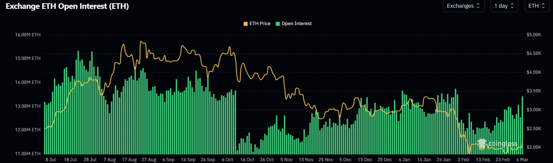 El movimiento fue acompañado por un aumento en el interés abierto de Ethereum (OI), que ha aumentado a 13.43M $ETH, su nivel más alto desde el 31 de enero. El OI del principal altcoin ha estado en aumento desde el 19 de febrero, añadiendo 1.2M $ETH en las últimas dos semanas. El crecimiento se produce en medio de 152 millones de dólares en liquidaciones de Ethereum en las últimas 24 horas, dominadas por 129 millones de dólares en liquidaciones cortas, según datos de Coinglass.