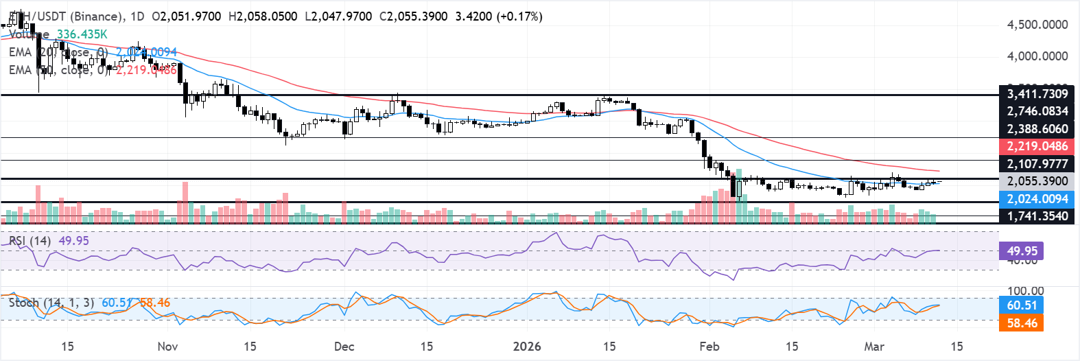 En el gráfico diario, $ETH cotiza a 2.055$. La tendencia a corto plazo es neutral con una ligera inclinación alcista, ya que el precio se mantiene por encima de la media móvil exponencial (EMA) de 20 días, que se ha aplanado cerca de 2.024$ y ahora respalda el último rebote. La EMA de 50 días alrededor de 2.219$ tiende a estar bien por encima del precio spot, enmarcando la estructura más amplia como una recuperación dentro de una fase bajista a medio plazo.