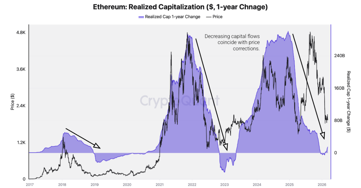 "En ciclos anteriores, particularmente durante 2017-2018 y 2021, los fuertes aumentos en la capitalización realizada coincidieron con importantes repuntes de precios de $ETH, reflejando grandes entradas de nuevo capital en la red. Por el contrario, cuando el crecimiento de la capitalización realizada se volvió negativo, como durante 2019 y el mercado bajista de 2022-2023, los precios de $ETH cayeron drásticamente," afirma el informe.