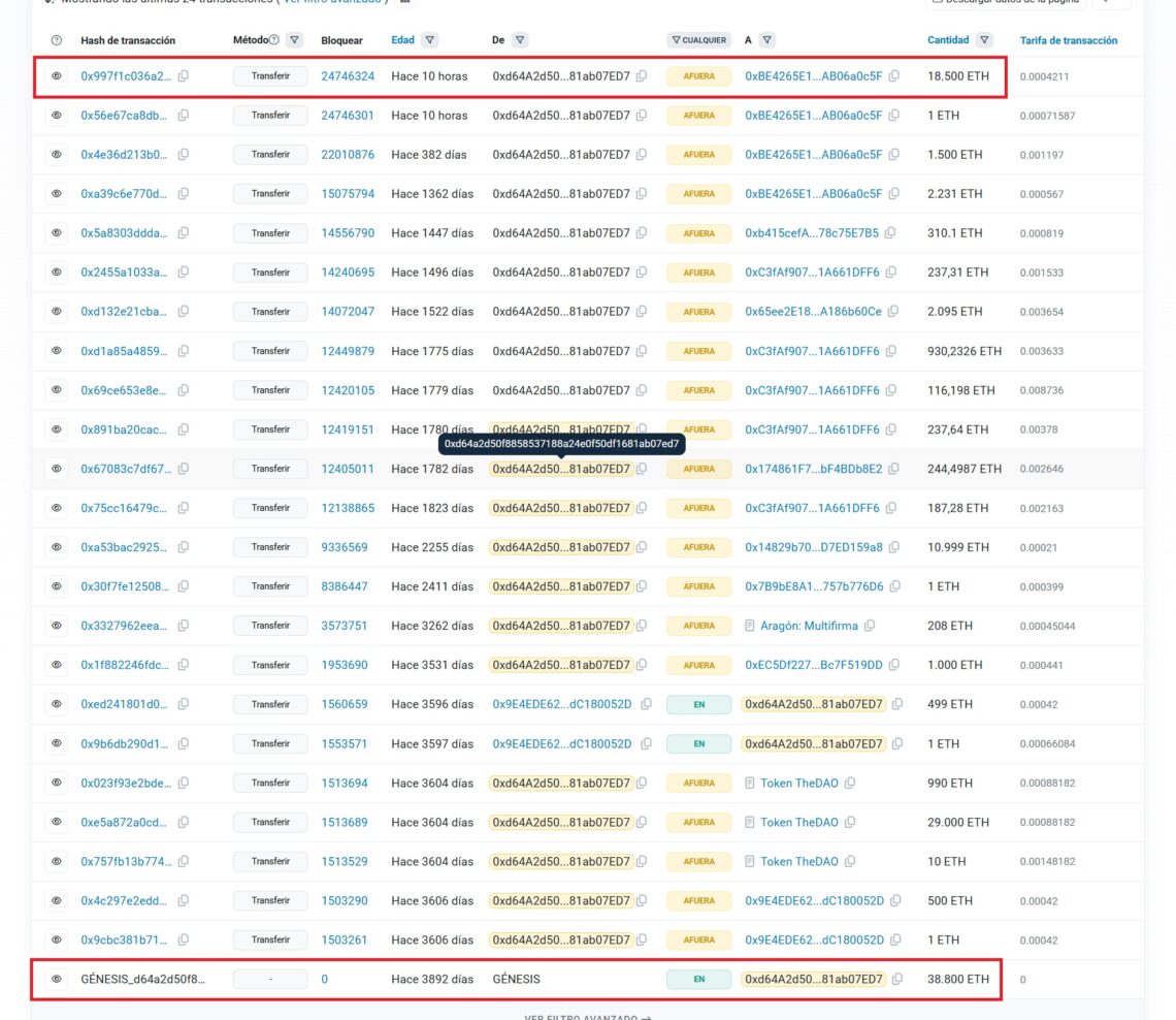 Por ejemplo, esta misma semana, otro inversor que mantuvo sus activos por más de una década también liquidó posiciones. El pasado 23 de marzo, una wallet que originalmente recibió 172.700 $ETH hace diez años —cuando el precio rondaba los 12,83 dólares— vendió 15.002 $ETH por un valor de 31 millones de dólares, como reportó CriptoNoticias.