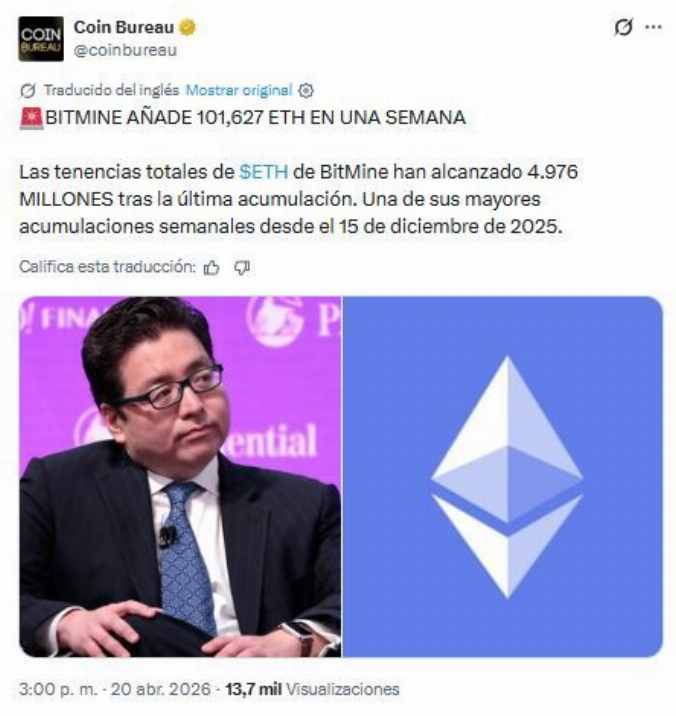 Los datos en la cadena de bloques y de tesorería muestran que la acumulación no solo está presente, sino que se está acelerando. BitMine añadió 101.627 $ETH en una sola semana, elevando sus tenencias totales a aproximadamente 4.976 millones de $ETH. Esto marca una de las mayores fases de acumulación registradas en los últimos meses y refleja un claro aumento de la exposición por parte de los grandes inversores.
