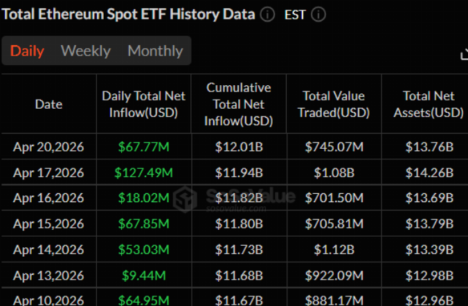 Los ETF al contado de Ethereum han registrado hasta la fecha 12.010 millones de dólares en entradas acumuladas, y las sesiones recientes muestran una entrada de capital constante. Solo el 20 de abril, las entradas alcanzaron los 67.77 millones de dólares, continuando una secuencia de flujos netos positivos tras la volatilidad anterior.