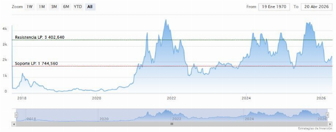 Al alza, el nivel inmediato a observar se sitúa cerca de los 2.800 dólares, que actúa como una resistencia clave. Un movimiento sostenido por encima de este nivel confirmaría la fortaleza y abriría el camino hacia los 3.300 dólares, donde se ubica la siguiente zona de oferta. A la baja, el rango de 2.200 a 2.300 dólares sigue siendo crítico. Una ruptura por debajo de esta zona debilitaría la estructura actual e indicaría que la acumulación aún no se ha estabilizado por completo.