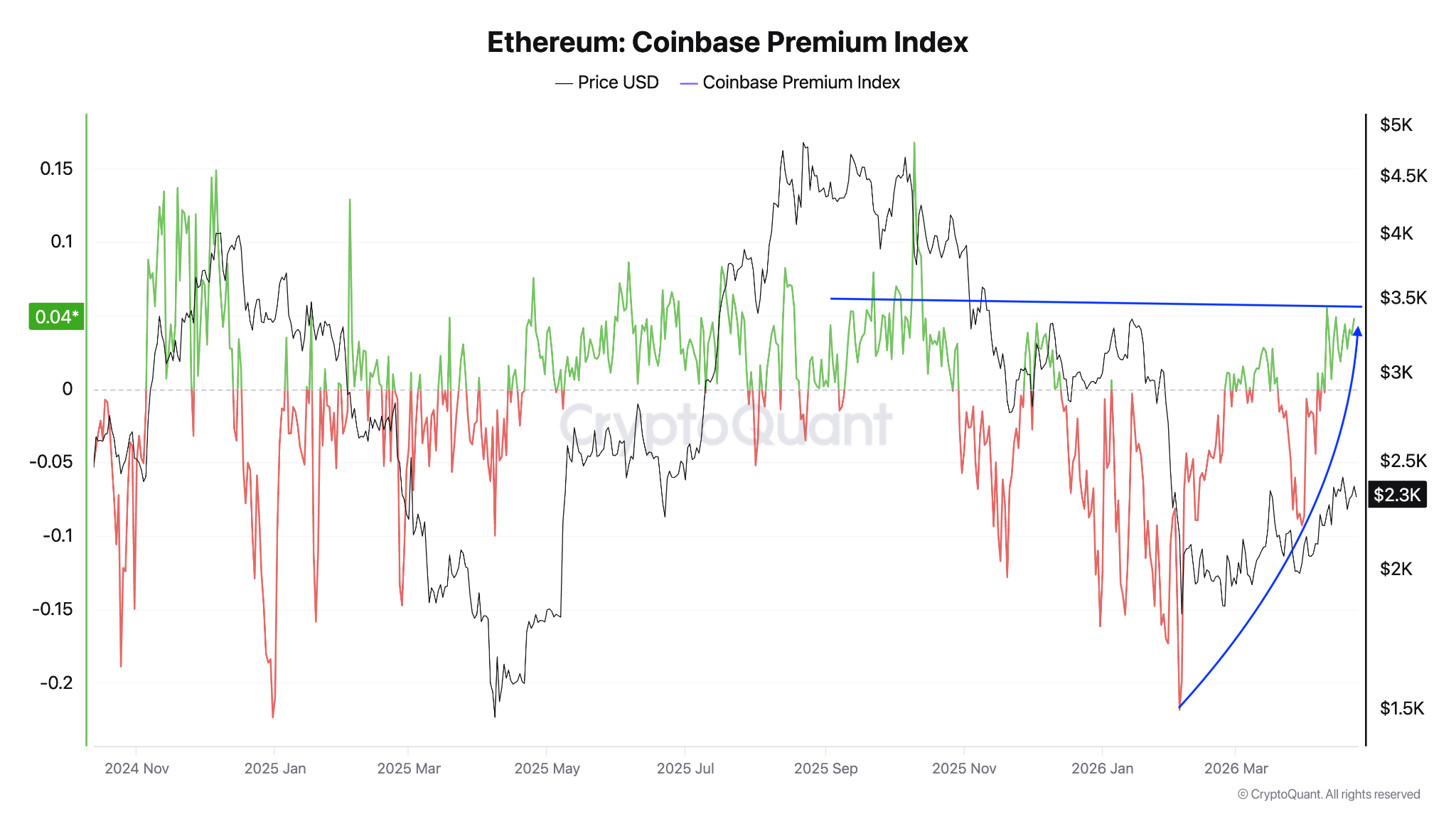 El índice de prima de $ETH de Coinbase mide la diferencia de precio entre el par $ETH/USD en Coinbase y el equivalente $ETH/USD de Binance.