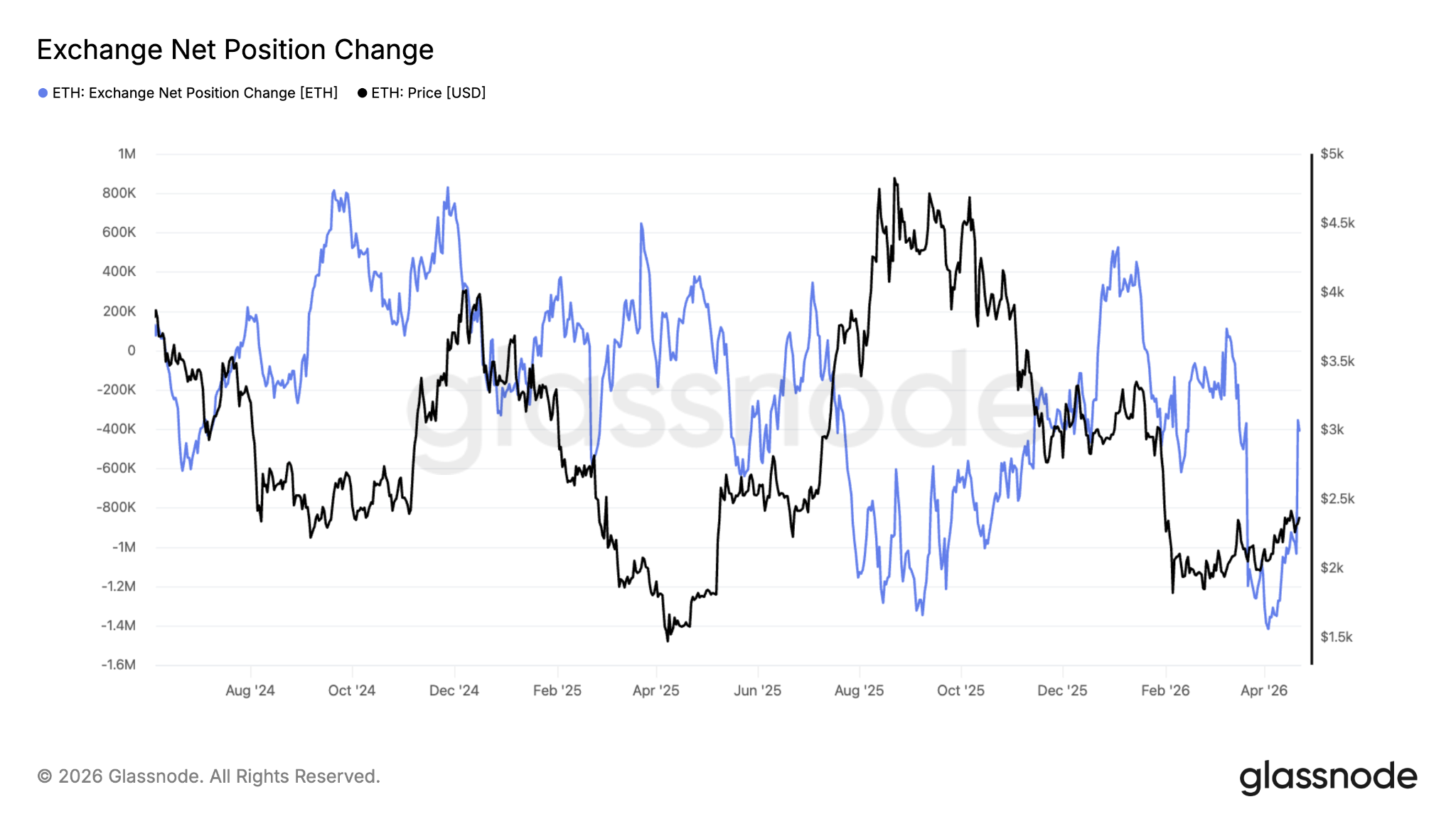 Esto se ve reforzado aún más por las salidas crecientes de los exchanges, ya que el cambio neto de posición de $ETH entre los exchanges cayó en 1,4 millones de $ETH el 2 de abril, lo que marca el mayor aumento en siete meses, según datos de Glassnode. El cambio neto de posición está en -351.300 $ETH en el momento de escribir este artículo.