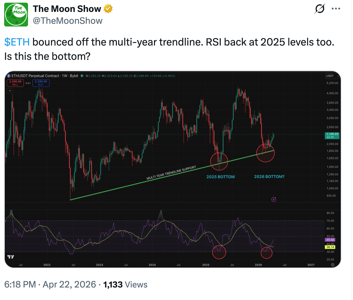 Ether está actualmente rebotando en una línea de tendencia de varios años que históricamente ha marcado los mínimos macro de precio de $ETH. Instancias anteriores en abril de 2025 y mediados de 2022 resultaron en rallies del 260% y 130% en el precio de $ETH, respectivamente.