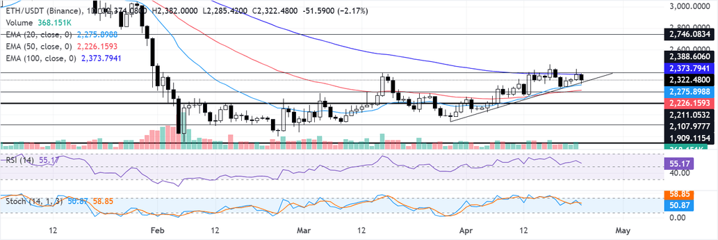 - $ETH ha mantenido el soporte del triángulo ascendente cerca de 2.300$, reforzado por la extensión del alto el fuego entre EE.UU. e Irán.