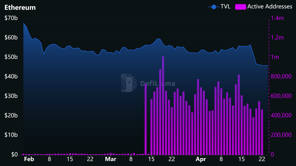 El valor total bloqueado (TVL) de Ethereum ha caído aproximadamente 10.700 millones de dólares hasta 45.800 millones de dólares en los últimos cinco días, según datos de DefiLlama. Al mismo tiempo, las direcciones activas han tendido a la baja.