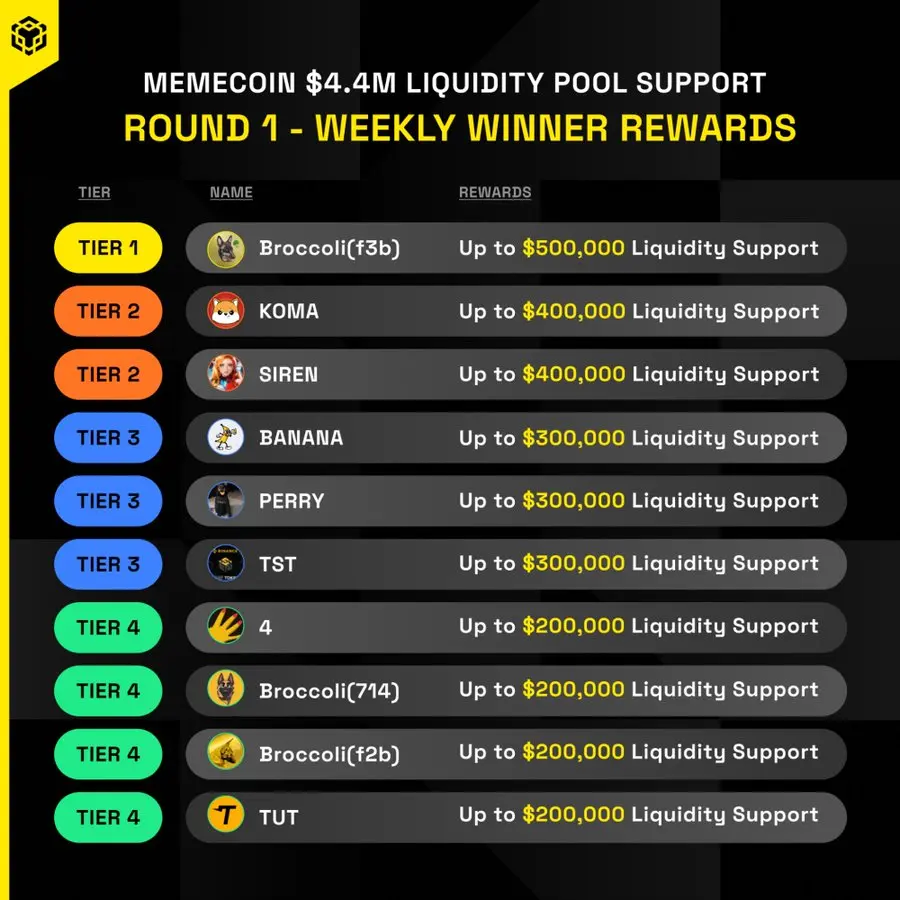 Además, Binance anunció los ganadores de la primera ronda del Programa de Apoyo de Liquidez de Memecoin. El proyecto Broccoli (f3b) recibió el nivel más alto de apoyo, totalizando $500,000. Mientras tanto, KOMA y SIREN recibieron $400,000 cada uno, mientras que BANANA, PERRY y TST fueron premiados con $300,000 en apoyo de liquidez. Otros proyectos, incluidos Broccoli (714), Broccoli (f2b) y TUT, recibieron $200,000 en apoyo.