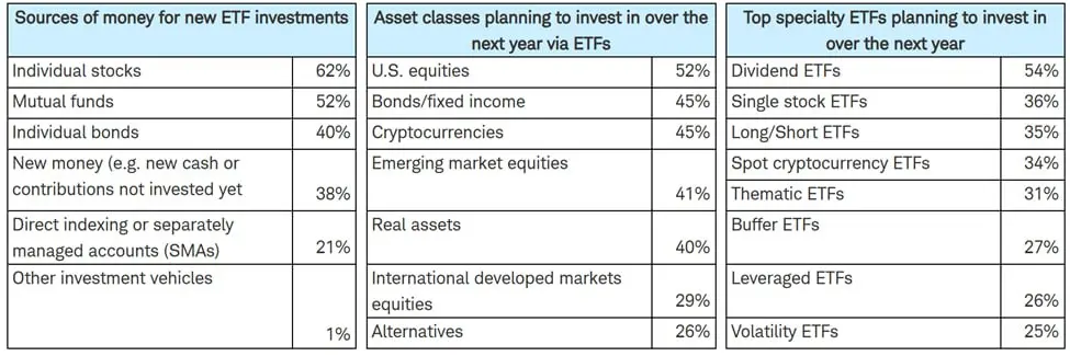 Según un informe de Schwab de 2024, al menos el 91 % de los inversores indicó que invertir en ETF era necesario para optimizar sus carteras. Esto ocurrió antes del lanzamiento de los ETF en EE. UU., lo que demuestra una creciente demanda de ETF de criptomonedas . Los informes también destacaron que los inversores jóvenes están ganando protagonismo en las inversiones relacionadas con criptomonedas, adoptando estrategias de diversificación.