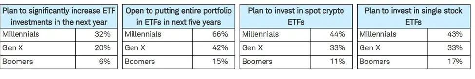 También existe una clara diferencia generacional en el interés por los ETF de criptomonedas, siendo los millennials (nacidos entre 1981 y 1996) quienes muestrantronpredilección. Al menos el 44 % de los millennials indicó que planea invertir en ETF de criptomonedas al contado.