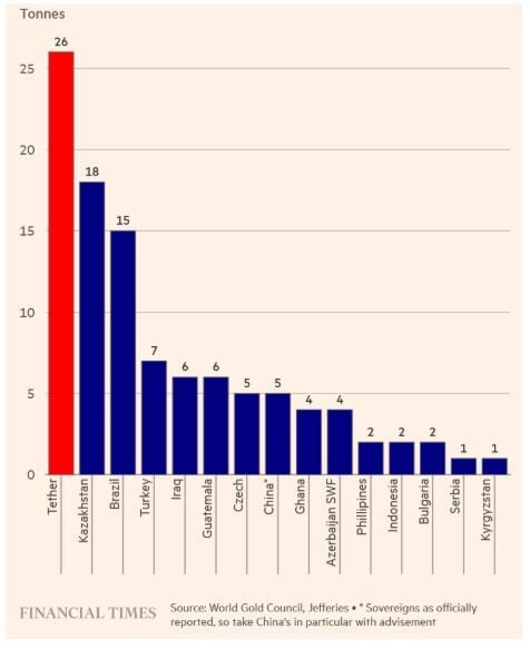 Tether se ha tomado en serio la idea de respaldar su moneda estable USDT y se ha convertido en uno de los mayores compradores de Oro. Incluso ha superado a la mayoría de los bancos centrales, según Collin Brown en ETH News.