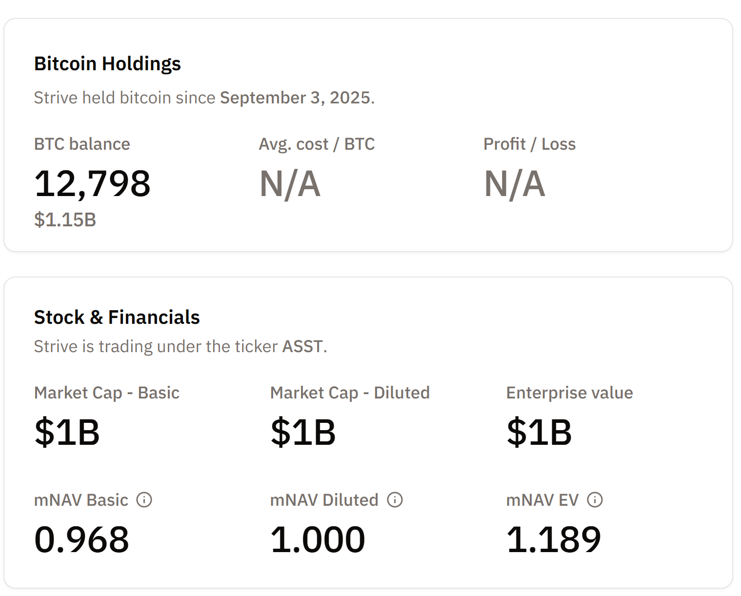 En mayo de 2025, Strive anunció una recaudación de 750 millones de dólares para establecer estrategias "generadoras de alfa" a través de compras relacionadas con Bitcoin. La empresa anunció otro programa de venta de acciones por un valor de 500 millones de dólares para recaudar fondos para compras adicionales de BTC en diciembre.