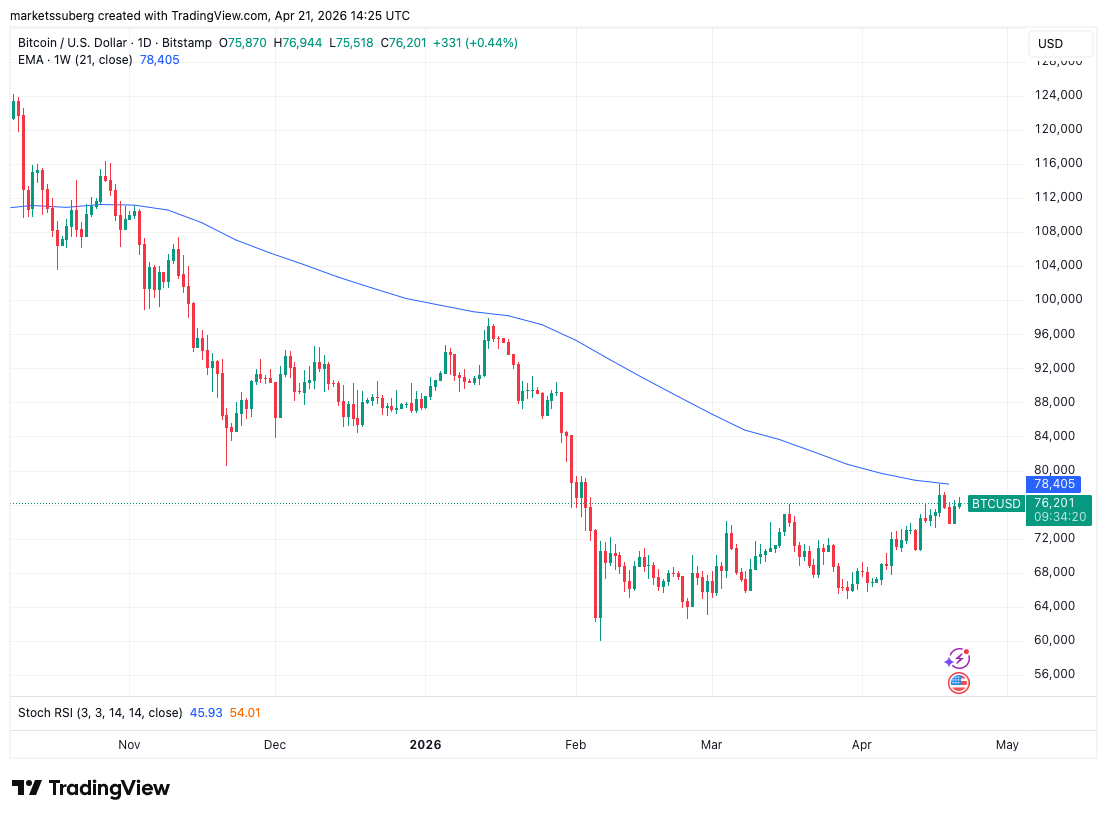 Los alcistas de Bitcoin aún necesitan superar la línea de tendencia de 21 semanas cercana que mantiene el precio anclado desde octubre de 2025.