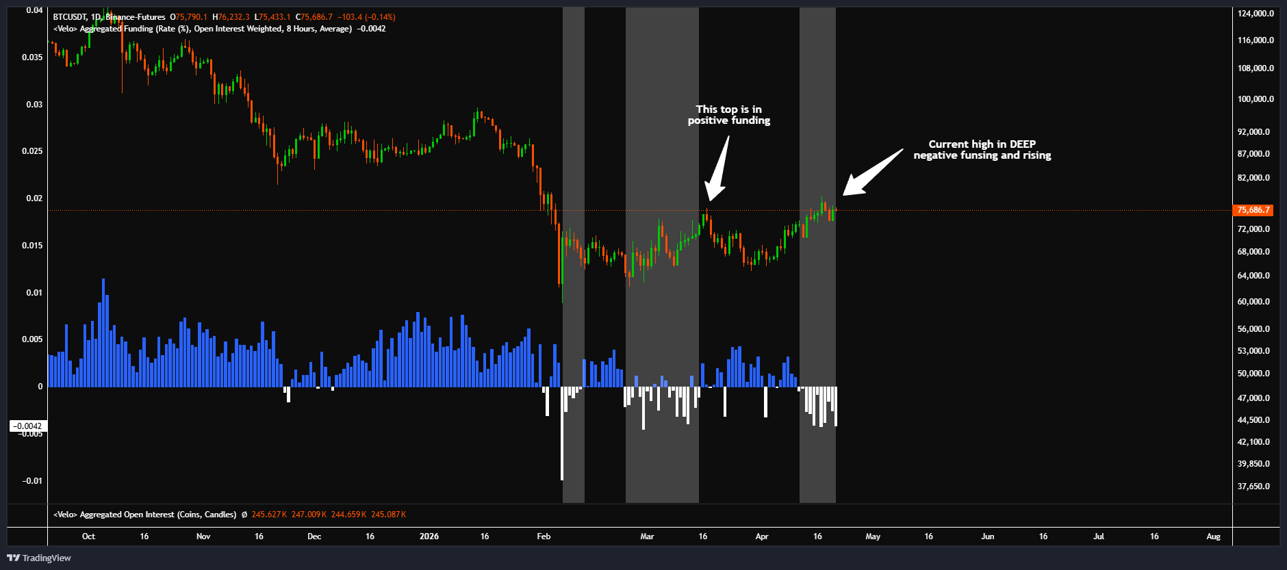 “Nunca hemos obtenido uno cuando el gráfico estaba subiendo gradualmente. NUNCA. Solo ocurrió durante los MÍNIMOS locales”, señaló el trader Osemka en X junto con gráficos que mostraban períodos de financiación negativos anteriores.