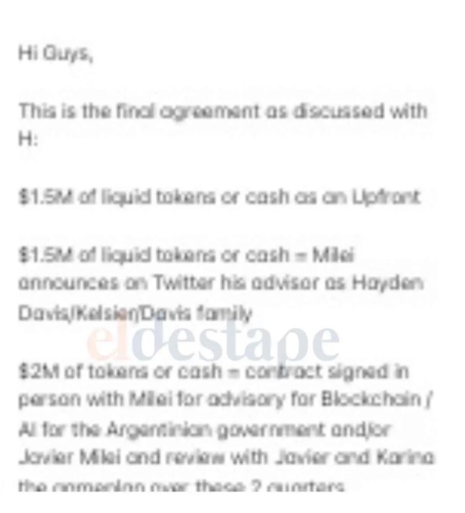 El documento recuperado por el medio local El Destape describe una estructura de pagos dividida en tres etapas. En primer lugar, se pactaron 1,5 millones de dólares (en tokens líquidos o efectivo) como adelanto. La segunda fase consistía en otros 1,5 millones condicionados a que Milei anunciara en Twitter (ahora X) que su asesor era Hayden Davis. Finalmente, el acuerdo contemplaba 2 millones de dólares adicionales tras la firma de un contrato presencial de asesoría con Javier y Karina Milei.