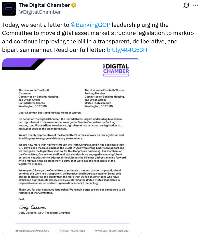Esto ocurre el mismo día en que el grupo de defensa de las criptomonedas The Digital Chamber envió una carta al Comité Bancario del Senado pidiéndole que adelante el proyecto de ley sobre la estructura del mercado de criptomonedas a una votación en el Senado “tan pronto como lo permita el calendario.”