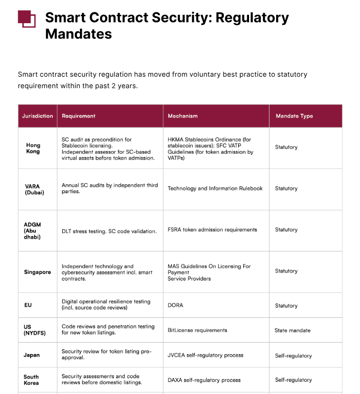 CertiK afirmó que las evaluaciones de seguridad de contratos inteligentes se están incorporando cada vez más a las expectativas de licenciamiento y cumplimiento en los principales mercados, con las auditorías de seguridad pasando de ser una mejor práctica voluntaria a un requisito estatutario o cuasi-estatutario en las principales jurisdicciones en un plazo de dos años.