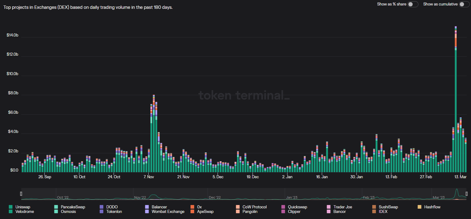 Un comportamiento similar ocurrió tras la caída de FTX y el refugio de los usuarios criptos en la autocustodia e intercambios descentralizados. El temor a que el contagio se expandiera a otras criptoempresas es similar al temor que actualmente sufren los bancos. Sin embargo, la firma de análisis Token Terminal sugiere que esta preferencia suele ser de corta duración mientras la marea sigue alta.