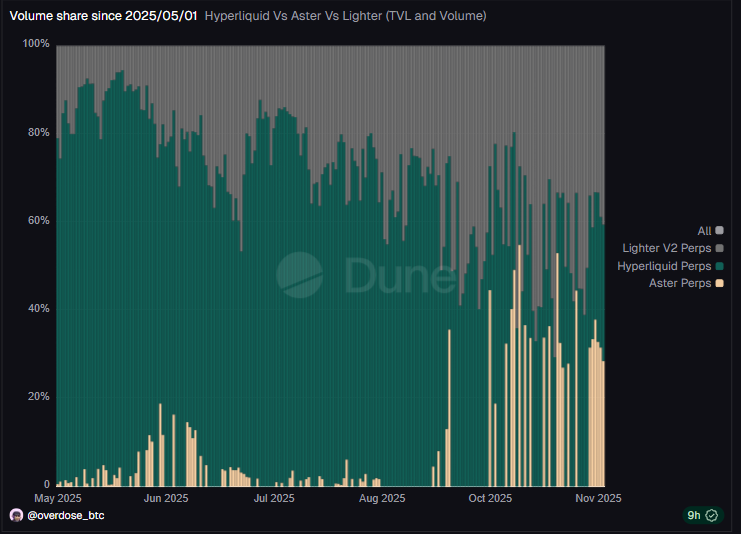 Aunque Hyperliquid sigue siendo el líder tradicional en el trading de DEX perpetuo, Aster ha aumentado su influencia. El trading se está volviendo más constante en noviembre, con volúmenes que representan hasta el 31% de la actividad de DEX perpetuo.