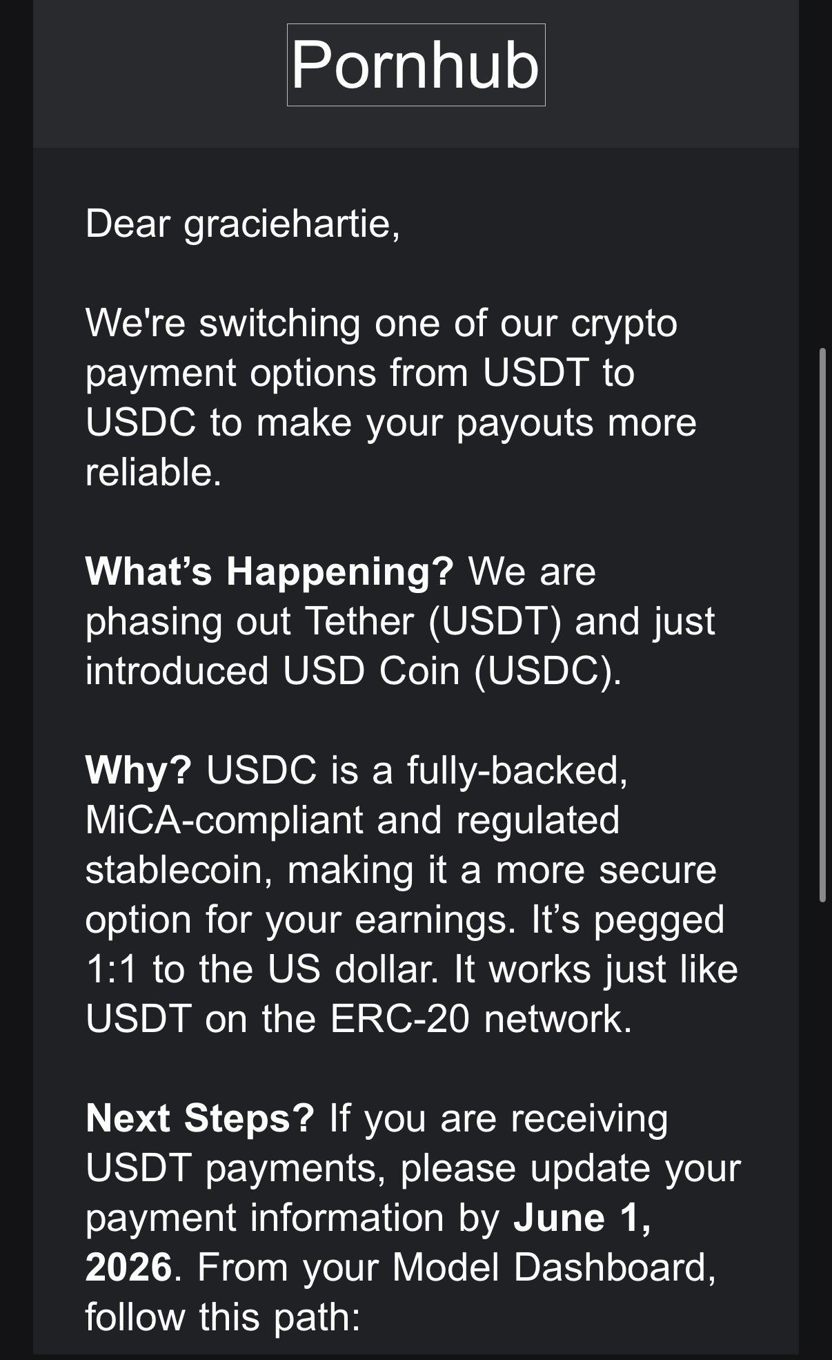 El cambio fue revelado por Gracie Hartie, una creadora de contenido con sede en Singapur, quien compartió la notificación oficial enviada por la compañía. Según el comunicado emitido por Pornhub, la elección de este activo se debe a que «$USDC es un stablecoin totalmente respaldado, regulado y compatible con MiCA».