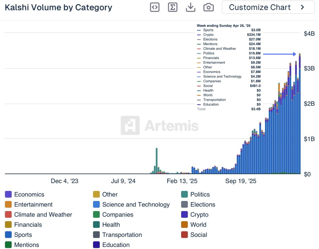 Durante la semana que finalizó el 26 de abril, Kalshi procesó un volumen de negociación de 3400 millones de dólares, según datos de Artemis. Esto marca un nuevo récord histórico para la plataforma de predicción de mercados. Sin embargo, lo que más llama la atención no es el volumen total procesado, sino su desglose por categoría. Solo los deportes representaron 3000 millones de dólares, es decir, el 88 % del volumen semanal total de Kalshi. Esta única categoría procesó un volumen superior al volumen semanal total de Polymarket en aproximadamente 1000 millones de dólares.