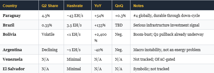 Un informe de Hashrate Index revela que Latinoamérica, pese a su enorme potencial energético, aún está rezagada en minería de criptomonedas. Paraguay ocupa el cuarto lugar mundial con 43 EH/s (4,3% del hashrate global). Sin embargo, Brasil y Venezuela destacan como los países con mayor proyección para convertir a la región en una potencia minera.