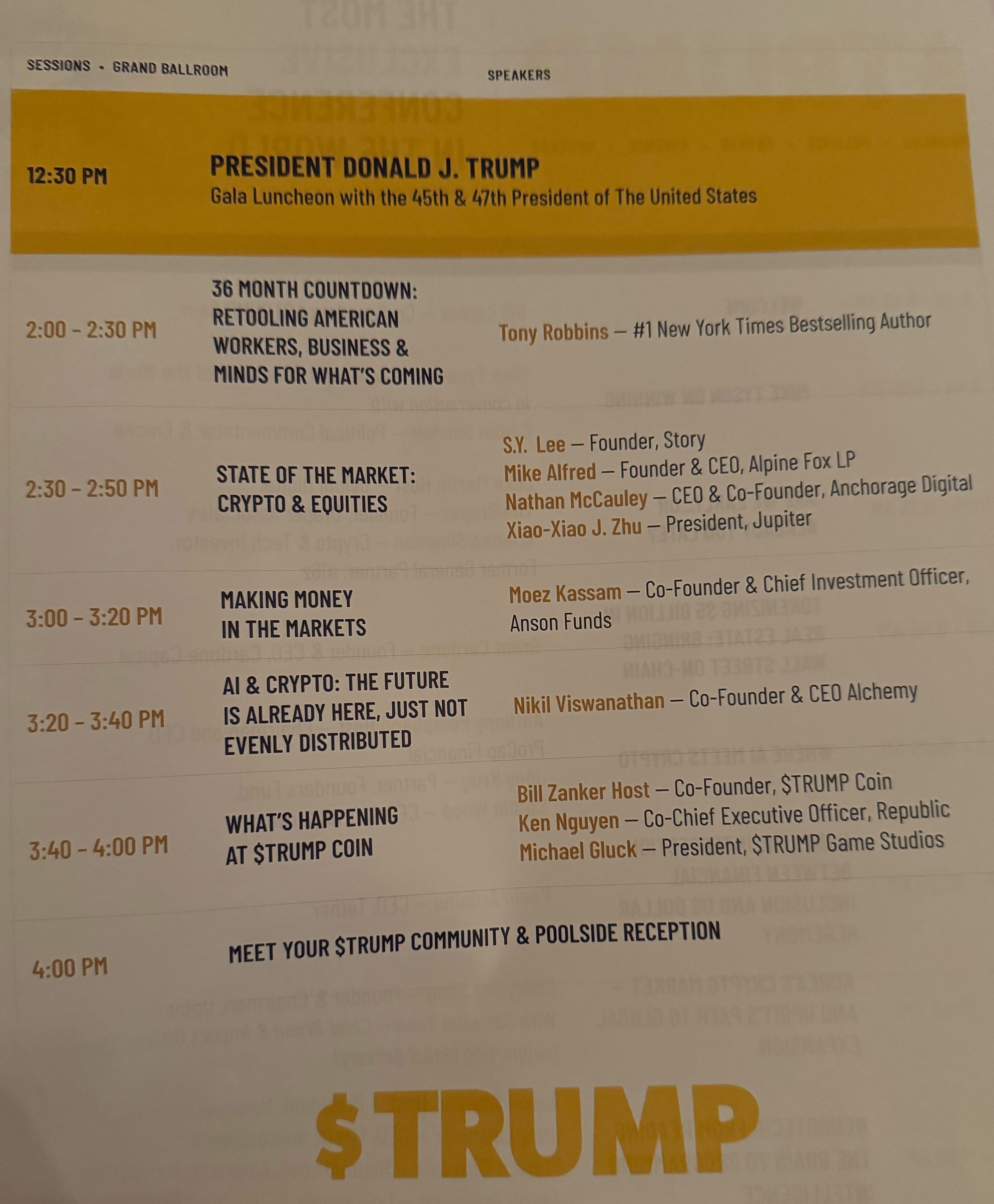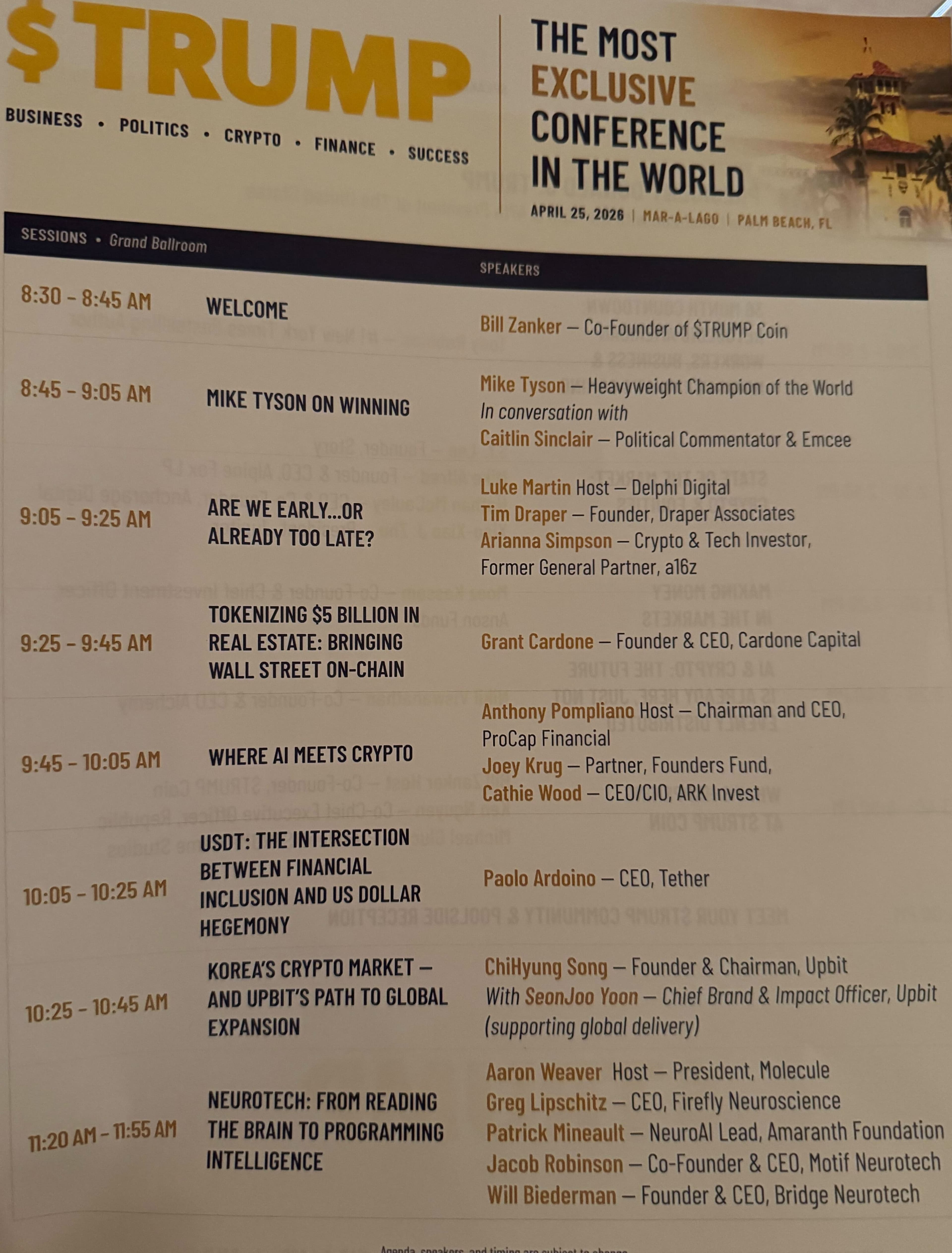 El evento, promocionado como "la conferencia más exclusiva del mundo", comenzó con Bill Zanker, cofundador del memecoin $TRUMP, y fue seguido por el legendario boxeador Mike Tyson.