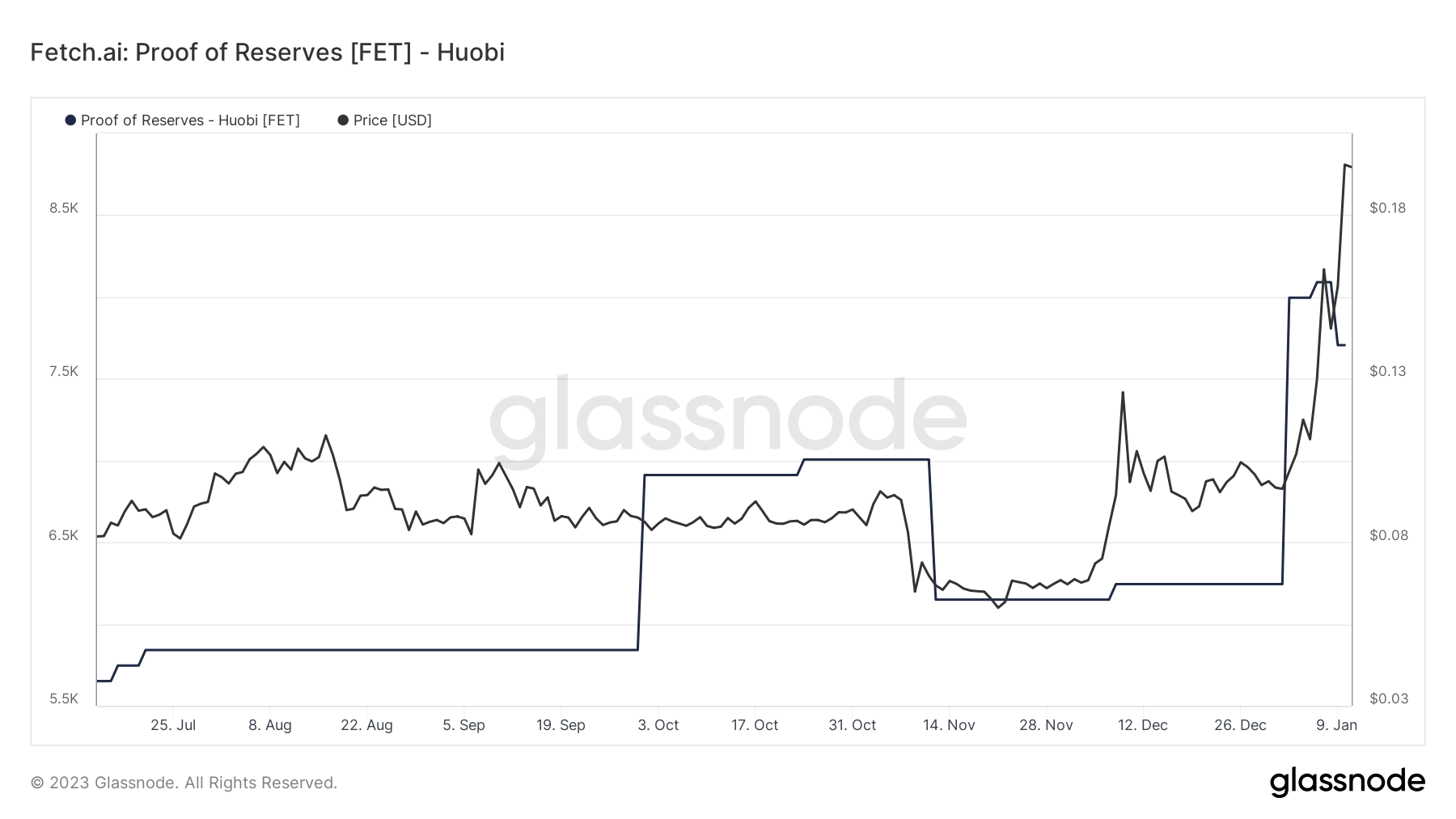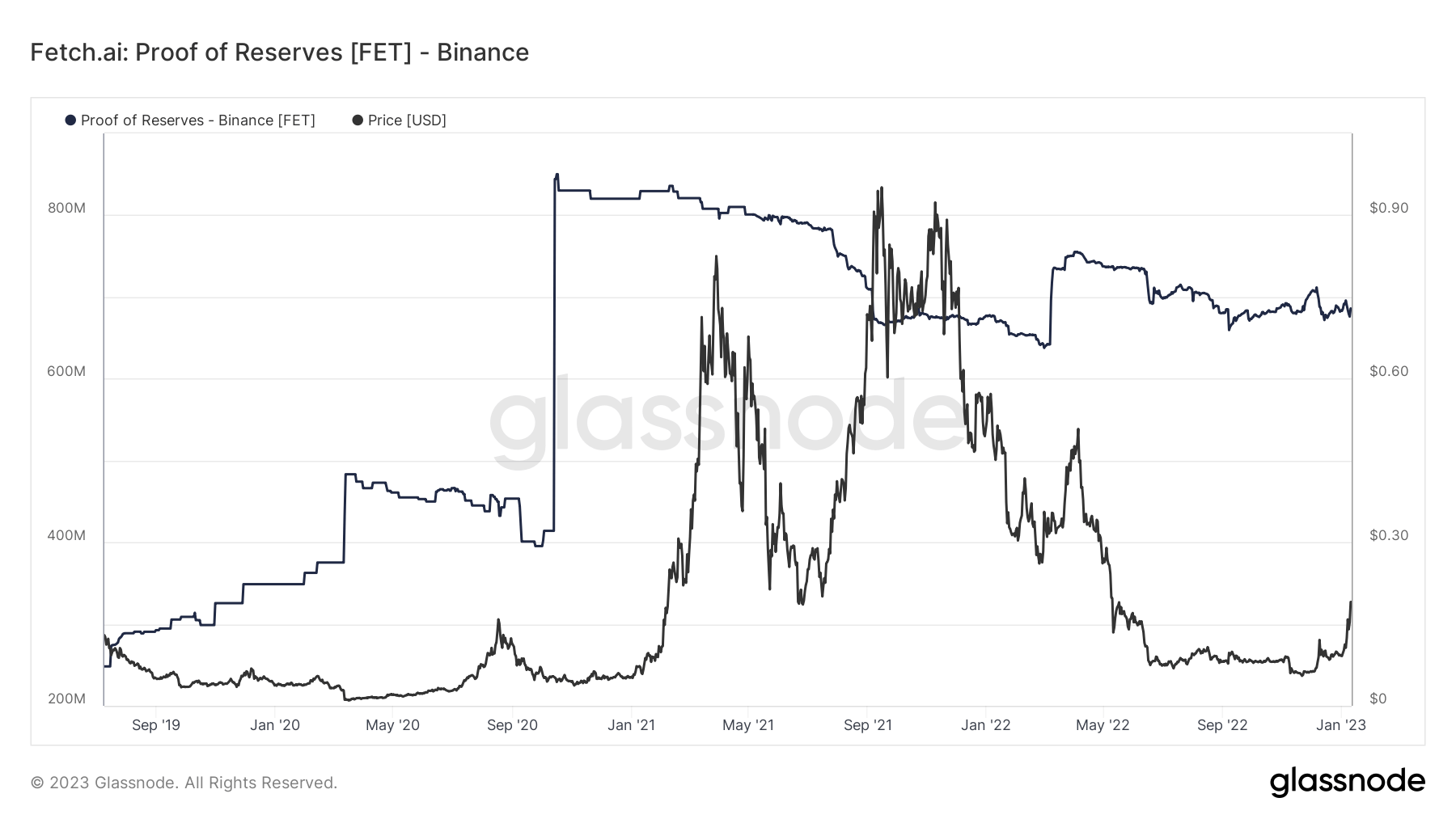 Fetch.ai (FET)has become a listed token on Proof of Reserves (PoR) for several exchanges, including Binance, Huobi and Bitfinex, according to Glassnode data.