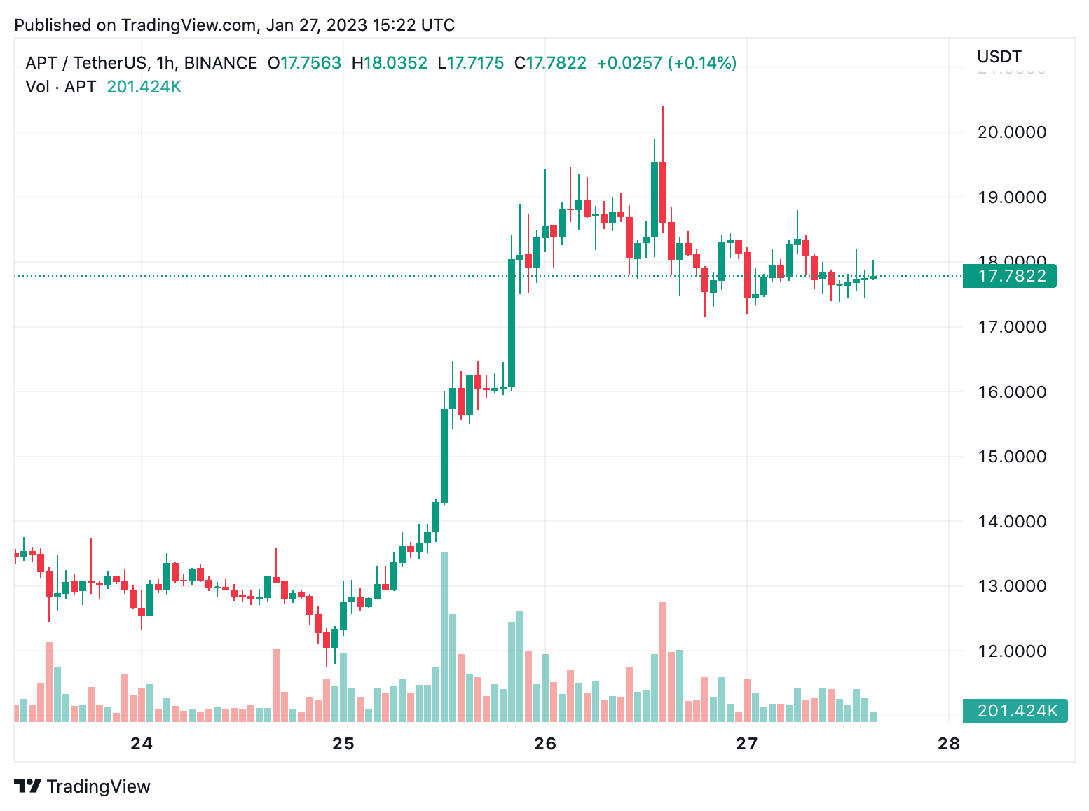 When the mainnet went live and aptos (APT) started trading, the price increased about 20%. However, like the rest of the cryptocurrency market during the last two months of 2022, the value of aptos dropped. On Dec. 29, 2022, aptos reached an all-time low of $3.08 per coin. As of Jan. 27, however, the value of APT is 474% higher. Today, aptos’ value is around 11% lower than its all-time high of $19.92 per coin, and in the past 24 hours, APT reached a low of $17.37 per unit.