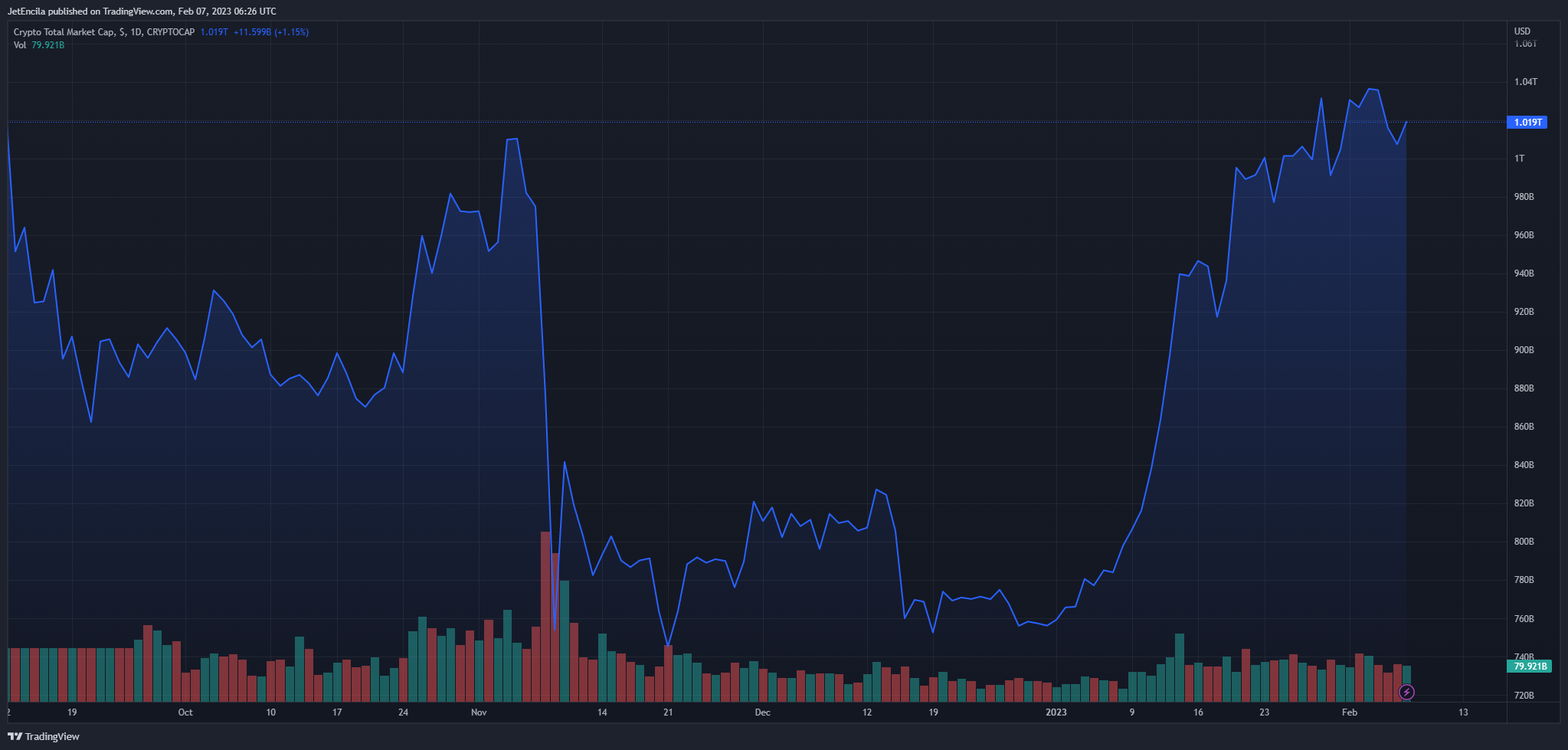 Crypto total market cap at $1 trillion on the daily chart | Chart: TradingView.com
