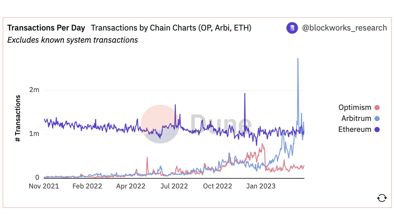 As far as the L2 scaling project Optimism is concerned, the network has seen roughly 150,000 to 430,000 transactions per day. When Arbitrum recorded the 2.72 million TPD, Optimism saw just over 228,000 transactions on the same day. Since the Arbitrum TPD $ATH, the network has seen around 1 million TPD since then, according to Dune Analytics data.