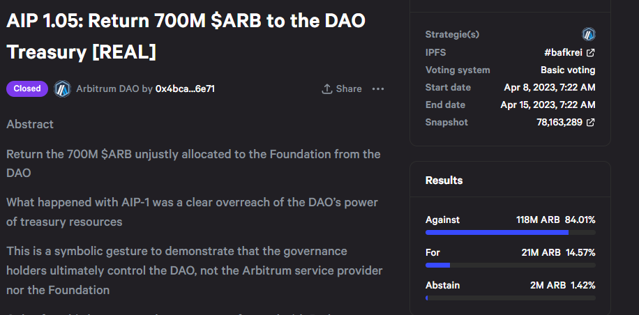 There were 118 million votes against the proposal, which accounted for 84.01% of the total vote. However, 21 million $ARB voted in favor of the proposal, comprising 14.57 percent of the total vote. There were, however, 2 million $ARB who abstained from voting.
