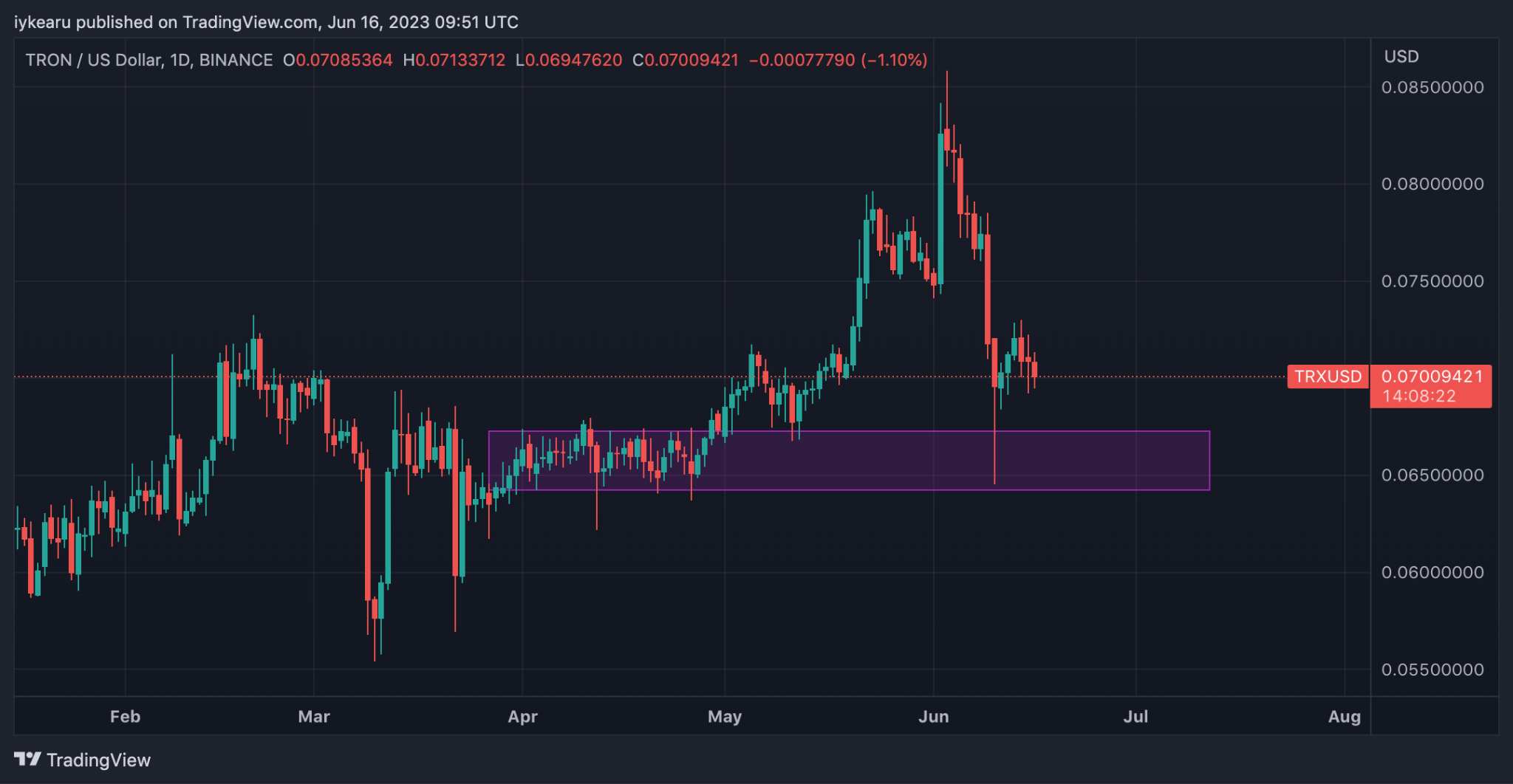 If the support at $0.691 holds, we may see TRX rally toward the next resistance at $0.0742, a break out, which could lead to a retest of the yearly high at $0.0858.