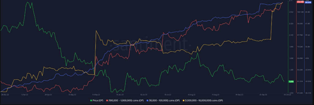 While Optimism struggled with bearishness over the past months, crypto whales took the situation as an opportunity to stack more coins. Santiment data shows wallets holding 10,000 – 10 million OP tokens have steadily accumulated.