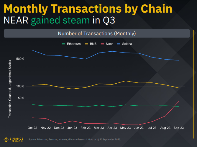 “Blockchain activity generally declined across the board in Q3 with a fall in the number of transactions across most blockchains. Notwithstanding that NEAR is starting from a low base, it has witnessed increasing usage driven by top-down partnerships and grassroots initiatives.”.