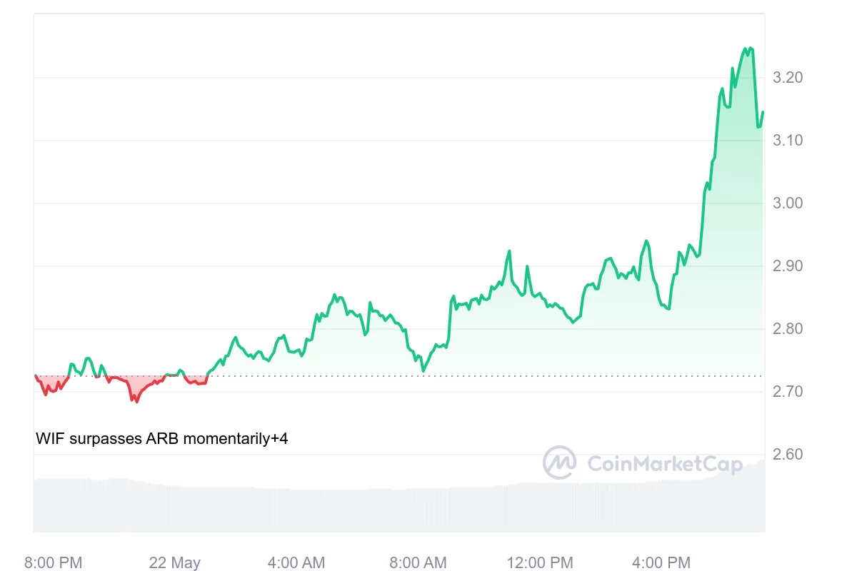 Today, the significant rise of a memecoin attracts attention in the cryptocurrency market. The altcoin named Dogwifhat (WIF) experienced a significant rally during the day, rising from $ 2.71 to over $ 3.20.