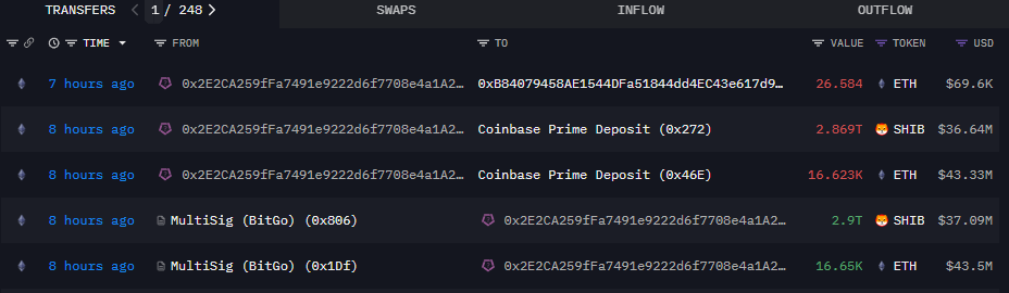 For context, a BitGo multisignature wallet, “0x808,” transferred 2.9 trillion SHIB ($37 million) to Wintermute the same day but at an earlier time, specifically at 20:53 (UTC). Interestingly, the movements involved other assets besides SHIB; the BitGo wallet also sent 16,650 ETH ($43.5 million), which also ended up on Coinbase.