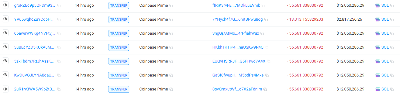 As a result, whales rushed in to move SOL out of Coinbase Prime. The Coinbase Prime wallet has been sending out thousands of SOL, with several large-scale transactions going to four newly created wallets, possibly belonging to one entity.