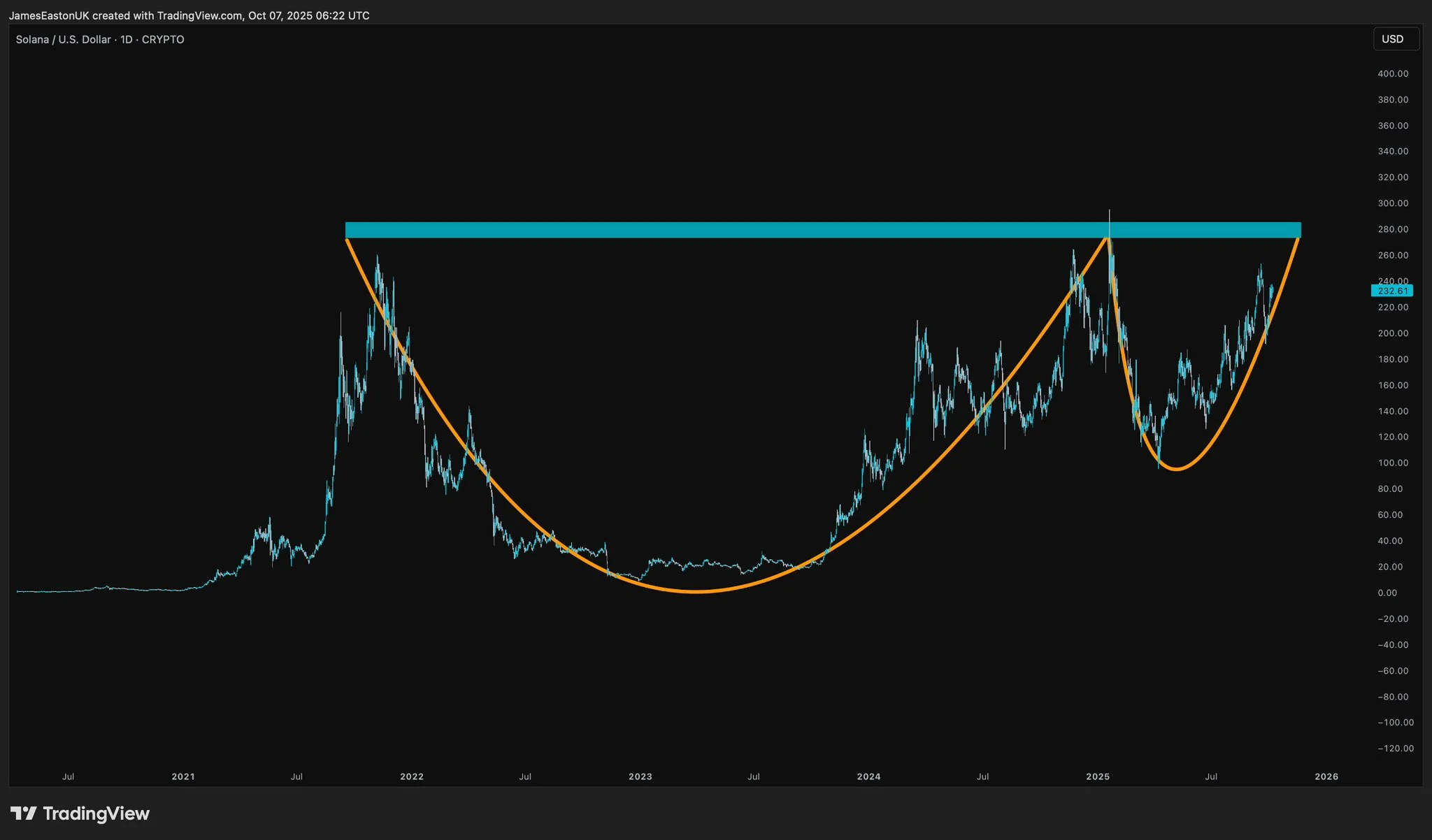 Despite a slight dip in Solana’s price to around $218, analysts remain overwhelmingly bullish. Solana Sensei, a popular market analyst, describes the current chart as “absurdly bullish,” highlighting a multi-year cup-and-handle formation nearing completion.