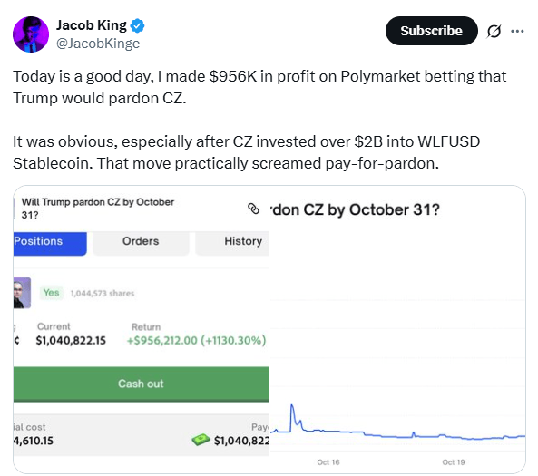Despite the low public odds—possibly due to Binance’s alleged role in the Oct. 10 liquidation cascade—some bettors remained convinced that CZ’s efforts to support the Trump crypto enterprise would ultimately pay off. In a notable outcome, one bettor reportedly pocketed nearly $1 million in profit after the pardon was made public.
