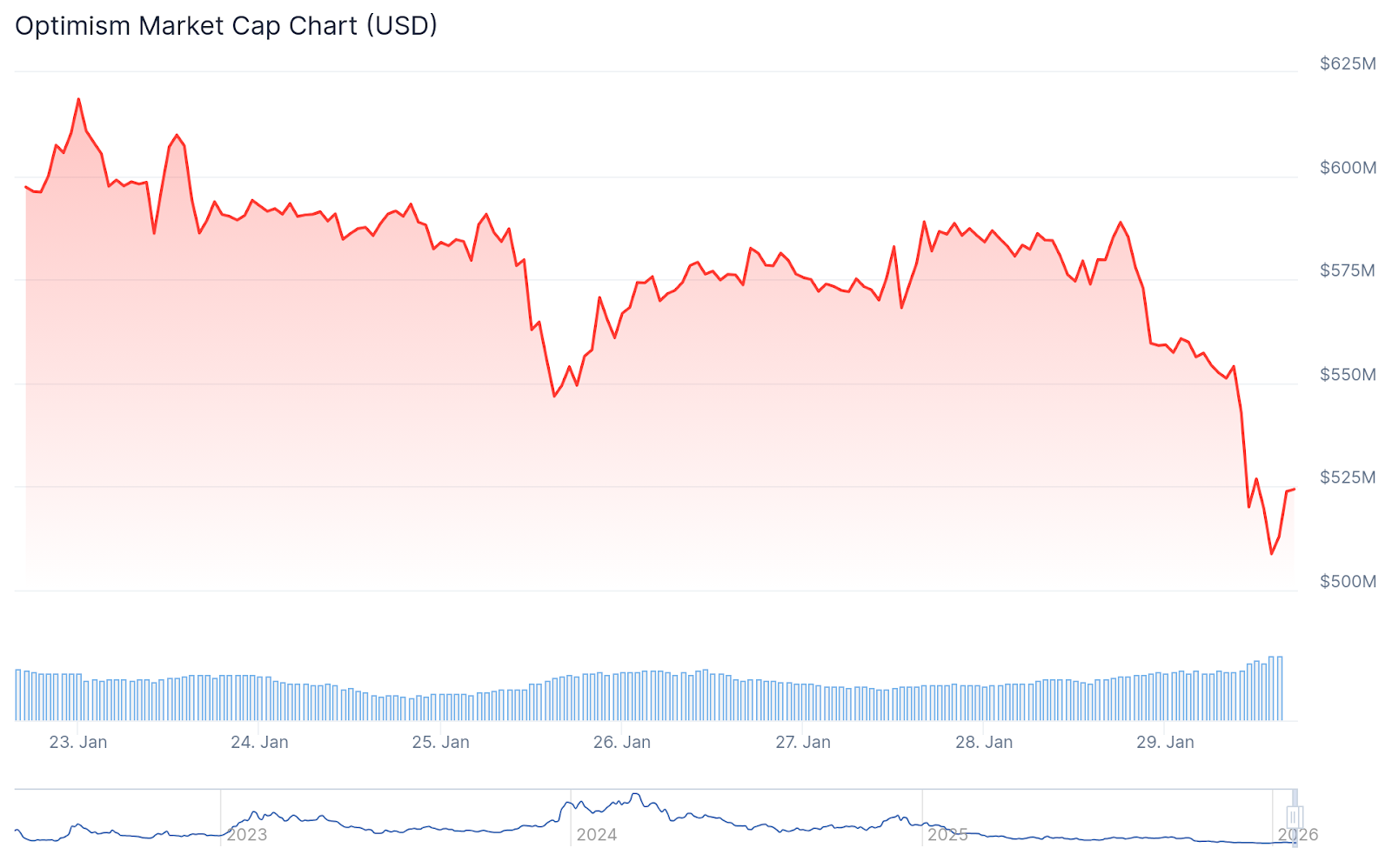 OP is down 10% today amid a broad market selloff, with BTC falling 5.5% and ETH slipping by 6.6%.