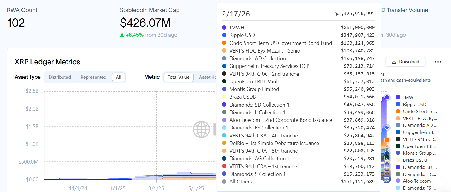 Meanwhile, the growth of the Ripple stablecoin, which has added $113 million in XRPL-based market value, Ondo’s Short-Term US Government Bond, and the AD Diamonds Collections, spurred the rest of the increase. Today, the XRPL hosts $2.325 billion in RWA, marking an increase of $1.33 billion since Jan. 1, 2026.