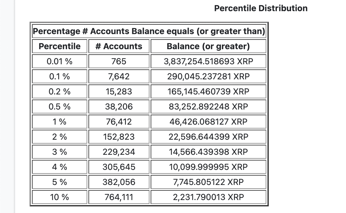 Fresh data from the $XRP rich list shows that to enter the top 1% bracket, a wallet must hold at least 46,426 $XRP. Currently, only 76,412 wallets meet or exceed this threshold out of a total 7.64 million $XRP holders.