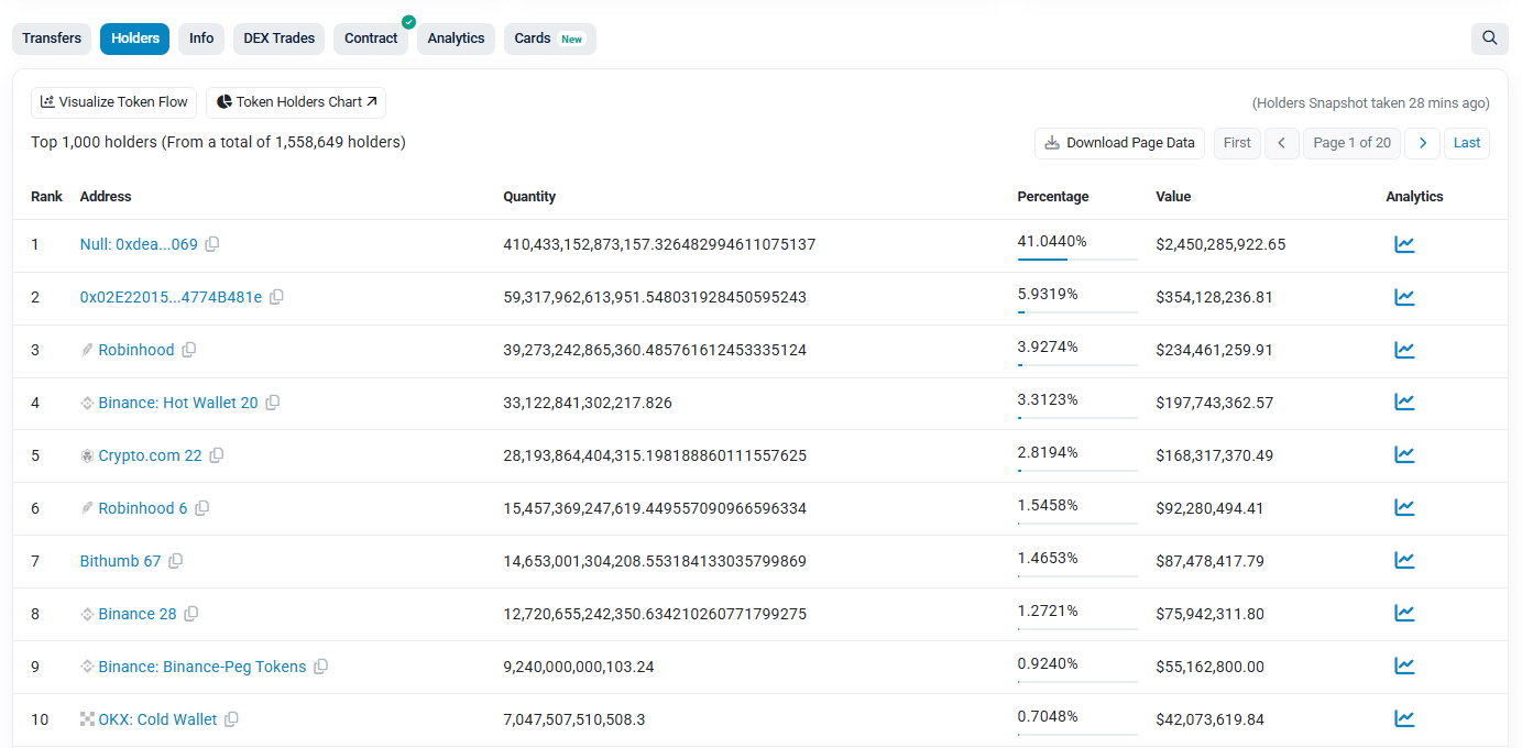 A closer look at the distribution shows that large entities still control a significant portion of supply, with the top 10 wallets accounting for 62.65% of the total supply. The burn wallet holds the largest Shiba Inu tokens, with about 410,754,609,891,520 $SHIB. This represents 41% of the total supply.