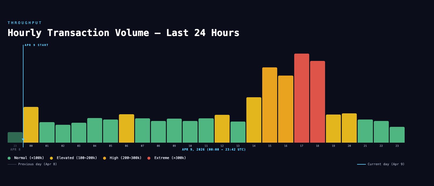 In the early hours, transactions stayed mostly below 100,000 per hour, with some spikes reaching between 100,000 and 200,000. This pattern continued until later in the day, when activity picked up.