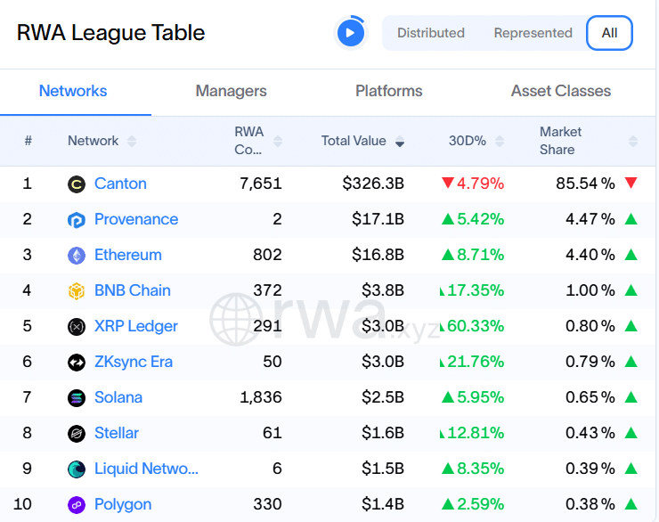 Specifically, the XRPL has now moved to third place among the largest networks by represented real-world assets, jumping 65% over the past 30 days to $2.5 billion at press time. $XRP’s market share has also increased 71.78% within the same period to 0.71%.