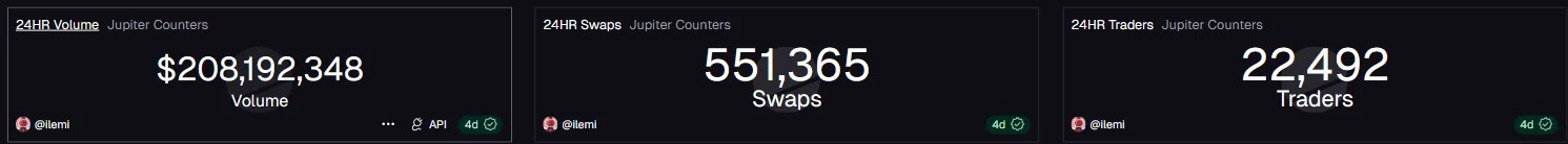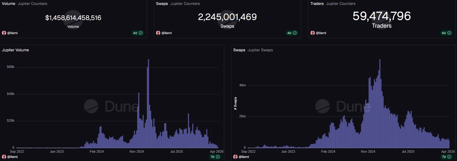The on-chain footprint is already large. The supplied Dune dashboard screenshot in this draft shows $1,458,614,458,516 in total Jupiter volume, 2,245,001,469 swaps, and 59,474,796 traders.